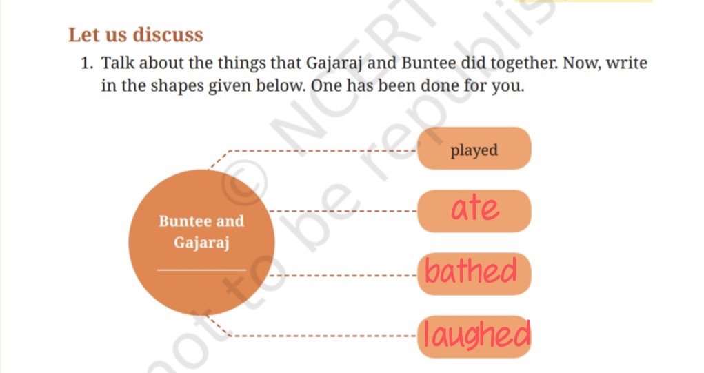 1. Talk about the things that Gajaraj and Buntee did together. Now, write in the shapes given below. One has been done for you.