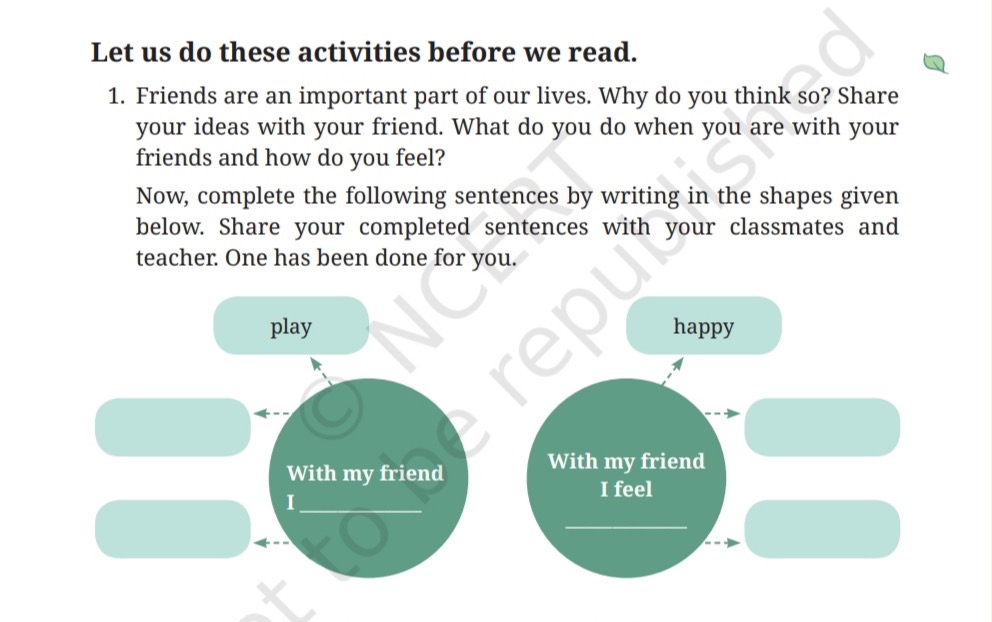 1. Friends are an important part of our lives. Why do you think so? Share your ideas with your friend. What do you do when you are with your friends and how do you feel?